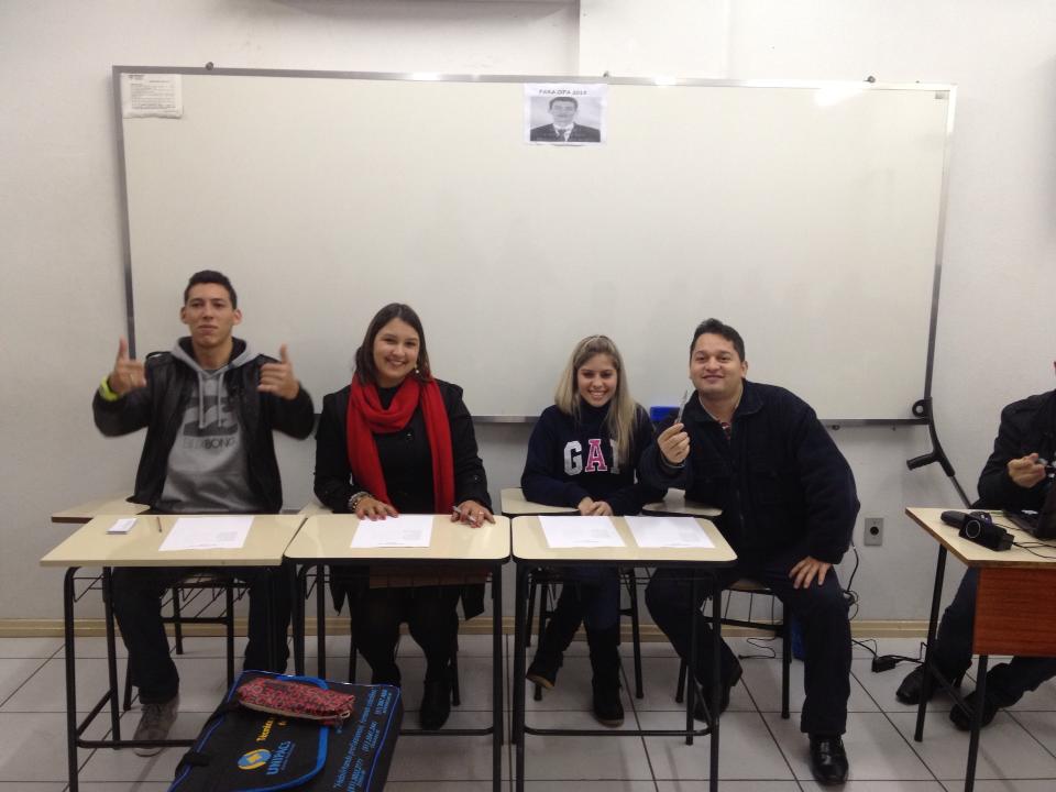 Movidos pelo espírito da democracia, o Professor Jairo Brasil e os alunos da Turma 3S11 de Segurança do Trabalho da unidade de Esteio, realizaram na última terça-feira, dia 02 de julho, a simulação do processo eleitoral da CIPA. Inicialmente foi nomeada pelo professor Jairo a Comissão Eleitoral, composta pelos alunos Franciele da Fonseca, Inamar Bitencourt, Orlei Correia e Thomer Comparin. Esta comissão ficou encarregada da organização geral do pleito, quando providenciaram a Convocação da Eleição, a Inscrição dos Candidatos, a confecção das Cédulas de Votação e a Cabine Eleitoral junto ao TRE.