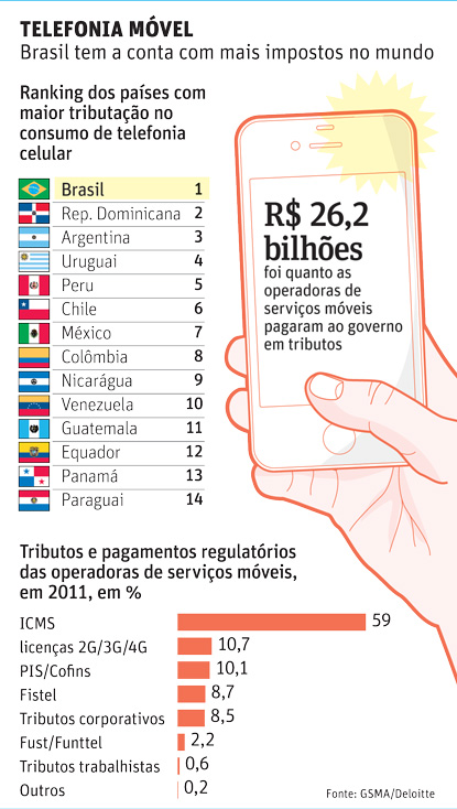 A carga tributária sobre os serviços de telefonia móvel (pós e pré-pago) no país é de 37%, em média. Já na República Dominicana, segundo colocado, é de 27%.